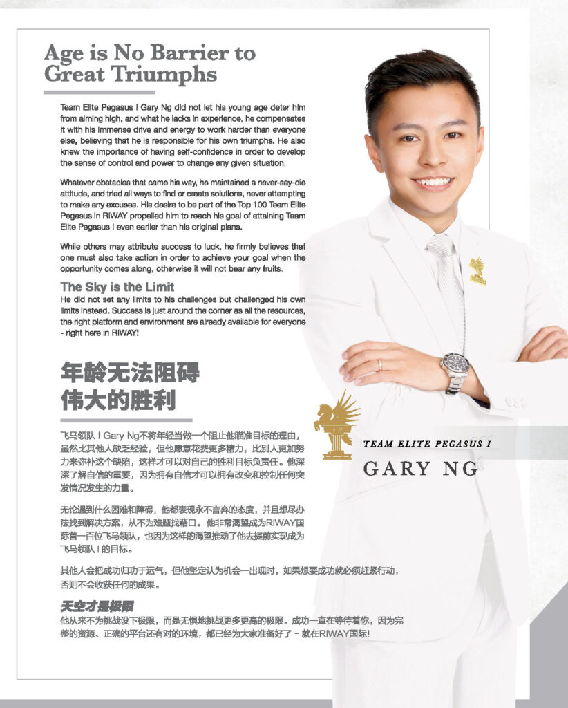 My name is Gary Ng, I am a distributor of Riway International and also the co-founder of JNG International Pte Ltd (a leading network marketing organization based in Singapore) for over 7 years.